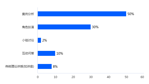 学习特点:学生思维敏捷,对新媒体和技术具有浓厚的兴趣,对视频和图像资料反应热烈,善于接受新鲜事物。学生在学习方式以及喜爱的学习资源上存在差异。80%的学生偏好角色扮演和案例分析等互动学习方式,8%的学生更倾向