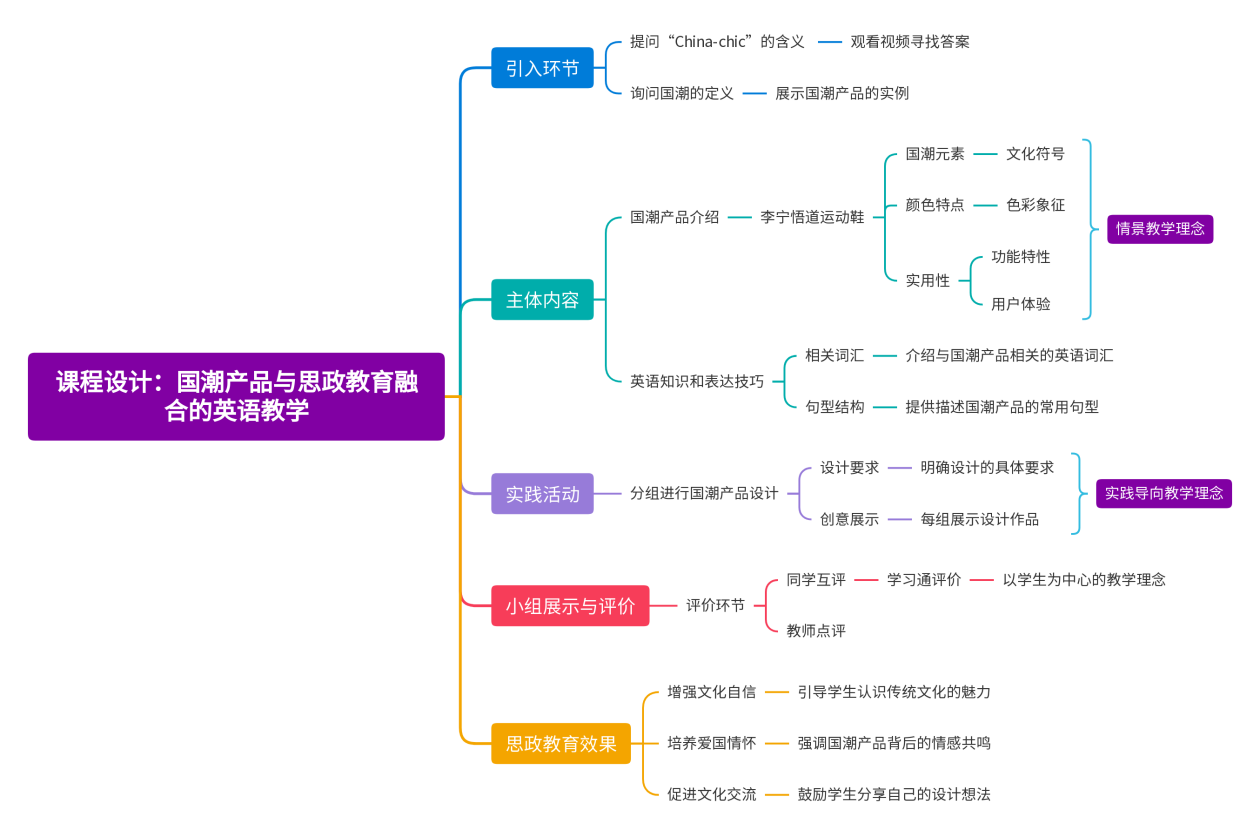 在讲解国潮元素、颜色特点和产品实用性时,进一步深入挖掘其背后的文化、历史和科技内涵,并与英语教学更紧密地结合。