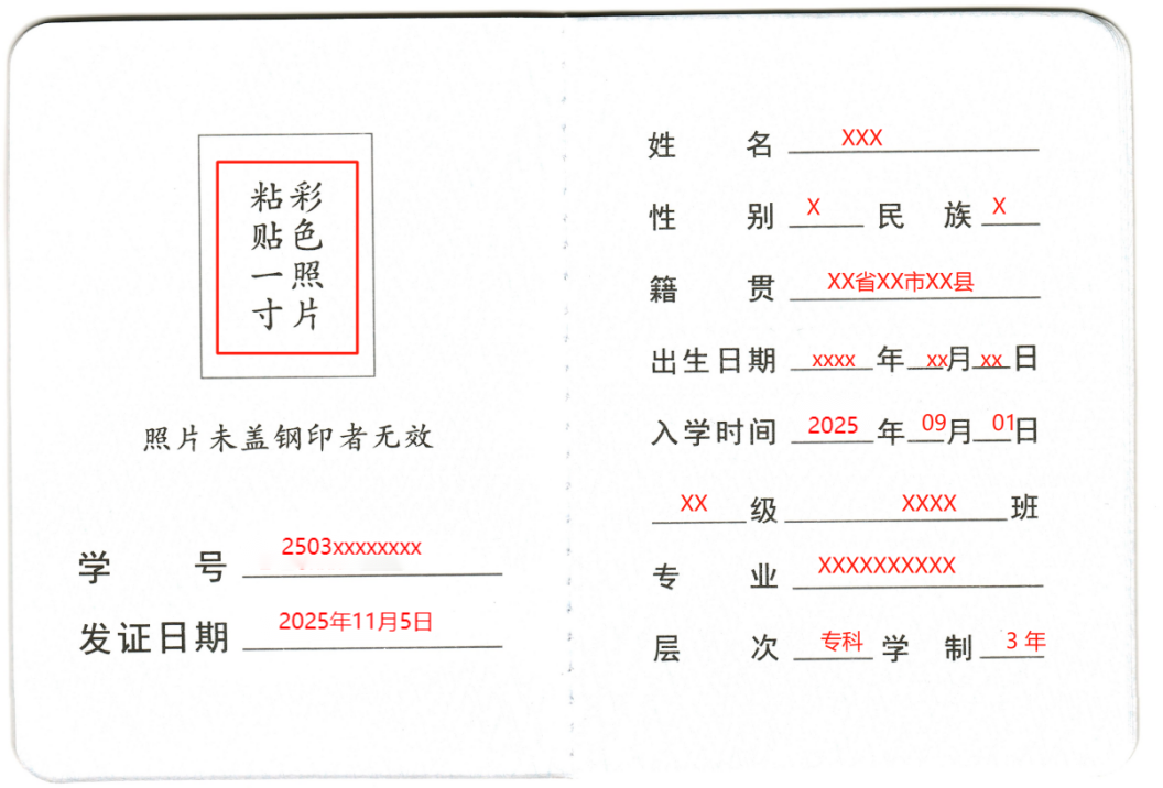 1.学生证请用黑色中性笔填写,内容准确、字迹工整、不得涂改(包括划改、使用修正液或刀片刮改),填写示范参见附件。