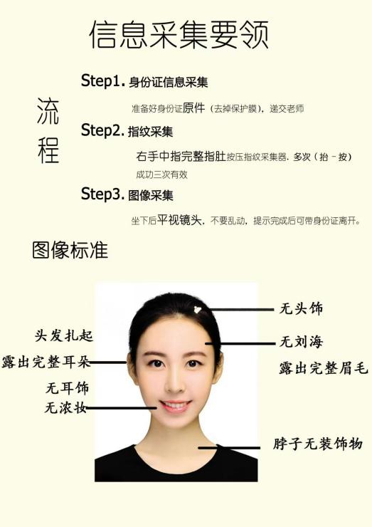 5.图像采集时:坐下后平视镜头,不要乱动,提示完成后可带身份证离开。6.信息采集完毕后,从信息采集教室后门离开。