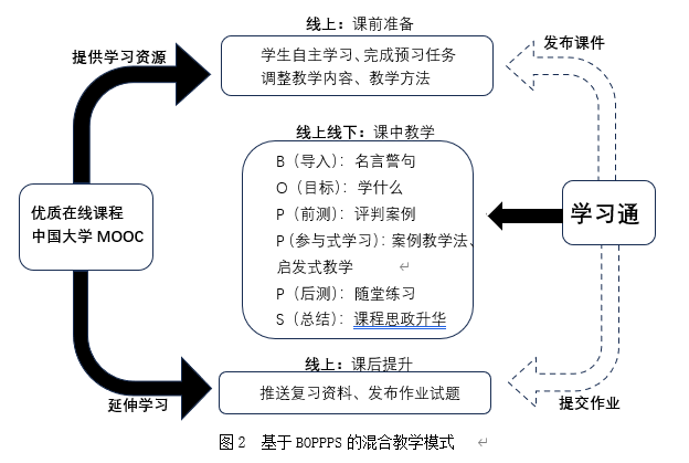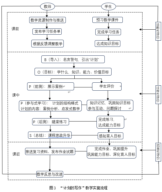 “计划的写作”一课将BOPPPS模式和学习通进行结合,利用中国大学MOOC优质资源,构建新型的教学模式——通过课前、课堂和课后三个环节展开线上线下相结合的学习方式,在课堂中依据BOPPPS模式进行各环节的设计(如下图),以期提高学生的课堂参与度和学习的深度,实现良好的师生互动。