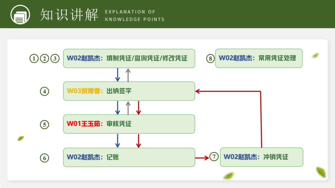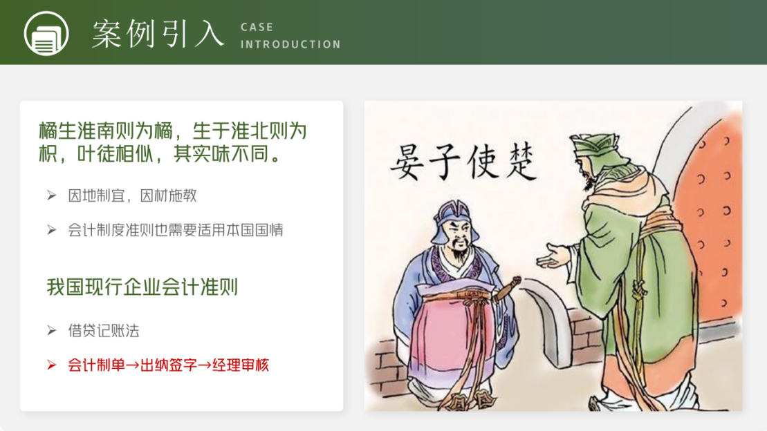 (1)线上学习 学生课前扫描课本二维码自学第三节期末业务处理的3.3.1-3.3.4部分,了解凭证处理流程、财会岗位权限等基础知识。 (2)线下教学 ①场景引入:借助历史典故,根据学生特点,融入思政元素,引出凭证处理流程,增强了学生的政治认同与使命担当,在激发学生学习兴趣的同时,提高学生的人文素养。