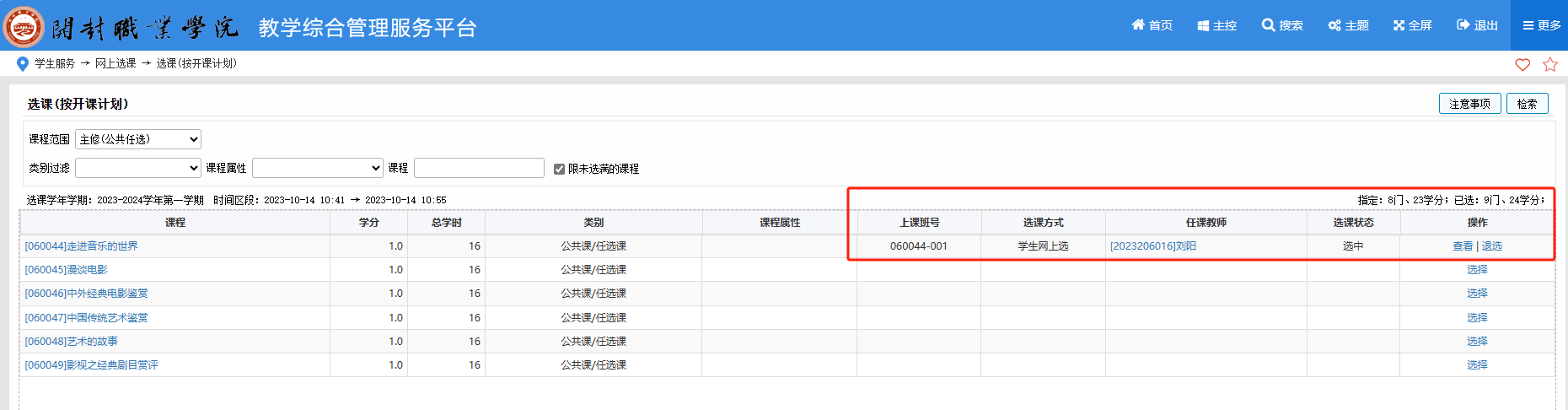 按照教学要求,本学期2024级学生公共选修课即将开课,2024级学生需首先进行网上选课(即登录学校教务系统进行选课),选课完成后课程从4月7日起陆续开课,其中信息工程、数字经济学院2024级学生本学期需学习艺术类选修课程;智能制造、文化旅游学院2024级学生本学期需学习普通类选修课程;同时,艺术类选修课程在选课结束后面向全体2024级学生开放,有意愿选修艺术类课程的同学可积极参与第二轮选课。现将具体事宜通知如下。