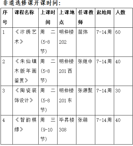 非物质文化遗产作为中华民族世代相传的宝贵智慧结晶与文化积淀,是承载民族精神与情感的重要载体,集中体现了各族人民卓越的创造力和深厚的文化认同。为深入贯彻落实关于保护与传承中华优秀传统文化的重要精神,推动非物质文化遗产(以下简称“非遗”)在校园内的普及与传播,特开设“非遗选修课”,现面向2025级学生开放报名。