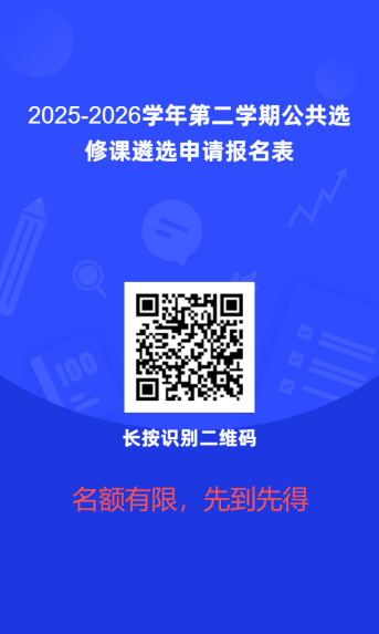 本次选课在问卷星进行,学生可自行扫描二维码报名课程,共4门大师课,均为线下课程。选课时间为:4月7日——9日,名额有限,先到先得。